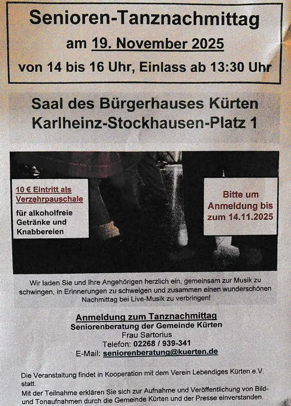 Mit der Teilnahme erklären Sie sich zur Aufnahme und Veröffentlichung von Bild- und Tonaufnahmen durch die Gemeinde Kürten und der Presse einverstanden.